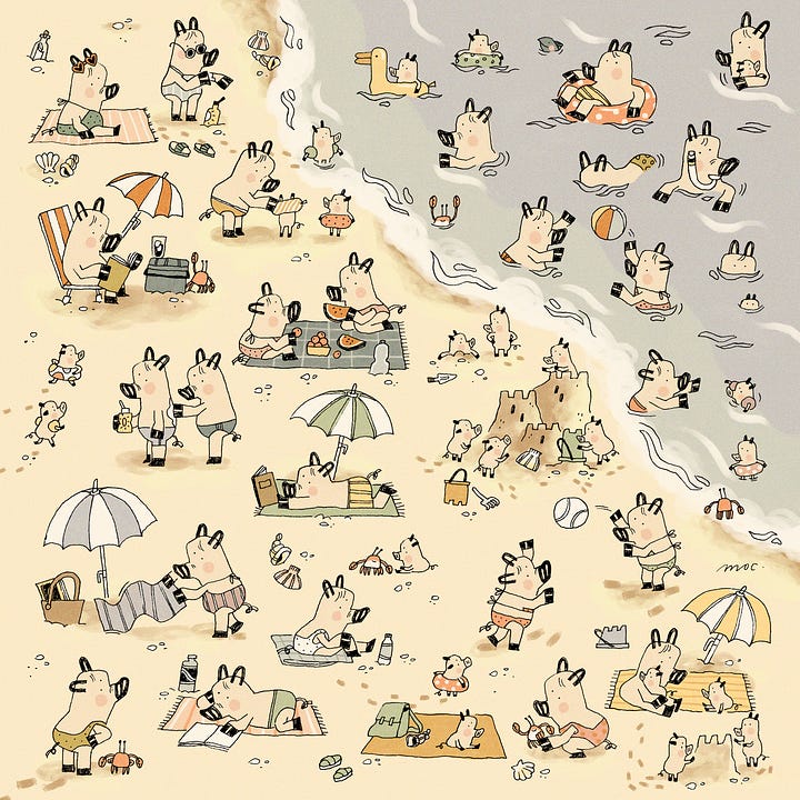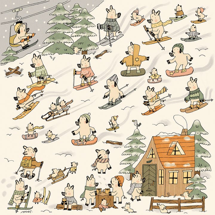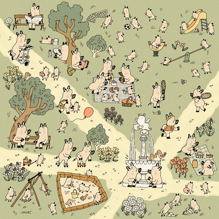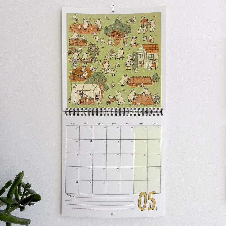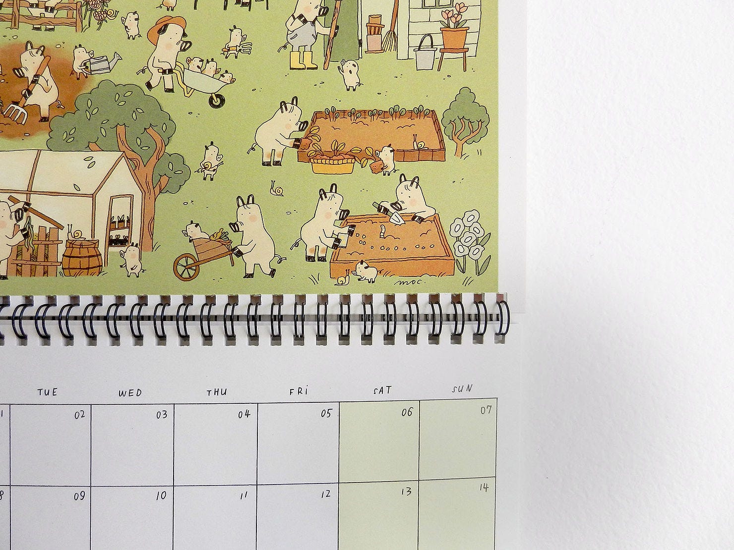 As you can see, the calendar is filled with pig characters. You might wonder, why out of all the animals existing, I chose to draw and dedicate a whole calendar to pigs. Well, I have a rather long answer to that. In the summer 2022, I stayed a night in a campsite, somewhere on the french mediterranean coast. The camping spot we found was situated beside a canal, which was dry due to the hot summer weather. It was already late in the evening and we had been setting up our tents when I heard unusual noise coming from the canal. To console myself, I thought it's most probably another camper taking a late night walk with their dog. The sound of dry leaves and branches didn't subside. I hate peering into dark holes or pointing a torchlight to aid my vision but I had to check what's going on. A mother with 4 babies was taking a walk. Not human, of course. It was a mama wild boar and her piglets taking a night stroll down the canal! As cute as piglets can be, they frightened me. I've never seen a grown-up wild boar before and her long trunk was fascinating! Although we laughed it off, all being shocked at seeing wild boars in the middle of a campsite during high season, I was scared. They were stuck in my head for days, so I thought I might as well put them on paper. Therefore I drew them. In my style, of course.