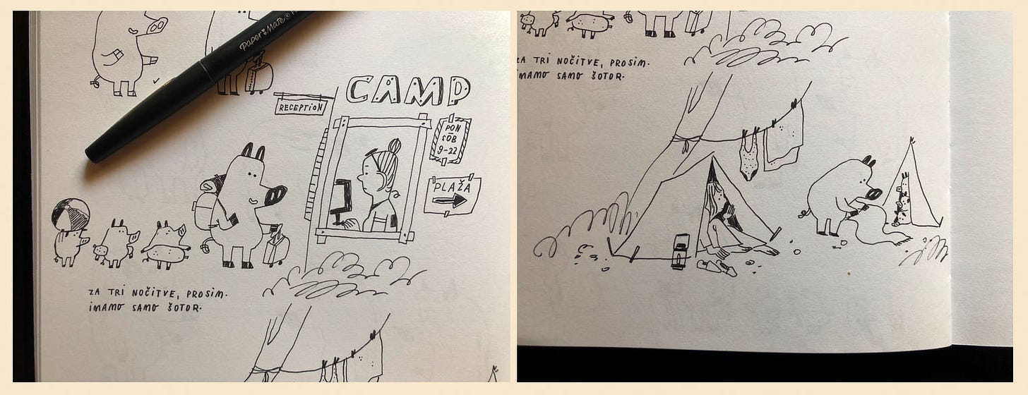 Doodle on the right: Mama boar setting up the pitch. Her piglets are peeking out of the tent. The neighbour camper just woke up and is confused with the unusual view.