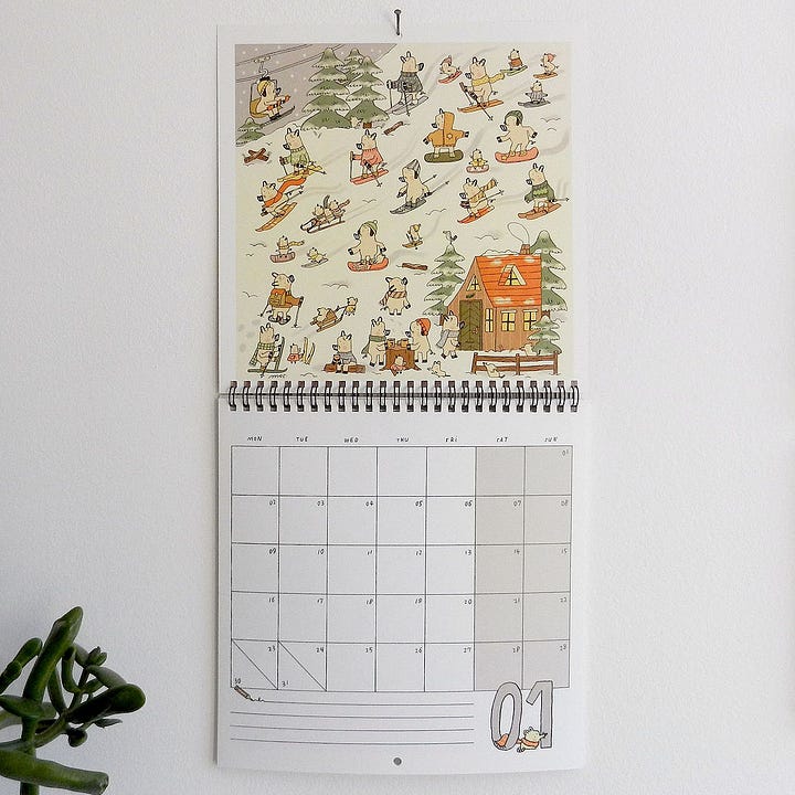 Last year I made a small calendar with a minimalistic design, featuring my original characters I was very fond of at the time. My main focus was to prepare everything alone - from drawing the illustrations for each month, designing the pages to printing & binding it together. It was surely time consuming but worth it - not just that I could produce calendars on demand and not store big stocks (space-wise and money-wise it's just not affordable for me), I learned a lot about the process through my own mistakes.